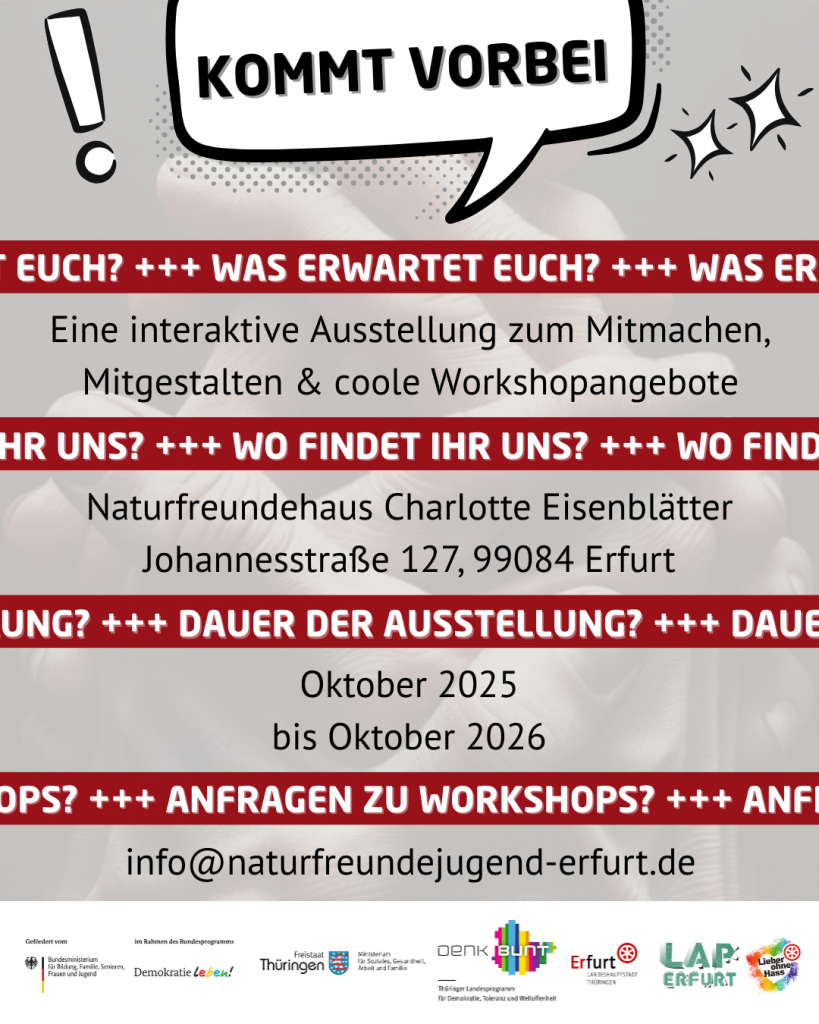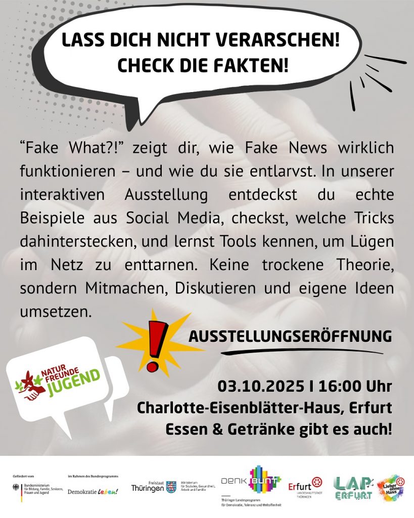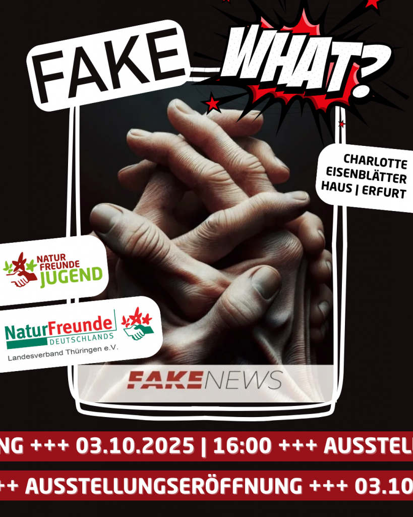 Am 3. Oktober 2025 eröffnet die Naturfreundejugend Erfurt die Ausstellung „Fake What?!“. Dich erwartet eine interaktive Ausstellung mit echten Beispielen, spannenden Einblicken und Raum zum Mitreden. Und das Beste ist, die Ausstellung wird ein ganzes Jahr lang zu sehen sein und kann für Workshops gebucht werden.